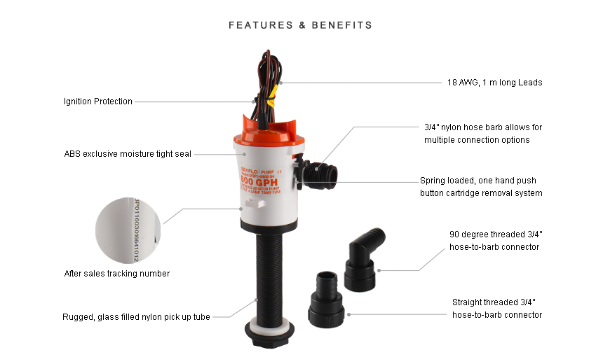 Ta pompka do przynęt Seaflo została stworzona dla poważnych wędkarzy. Nasze pompy napełniają zbiornik na żywe ryby czystą, natlenioną wodą, aby zachować świeżość połowu. Nasza konstrukcja wkładu umożliwia dostęp do silnika i wirnika bez konieczności wymiany instalacji. W zestawie wszystkie akcesoria potrzebne do montażu, w tym nakrętka uszczelniająca i podkładki.
