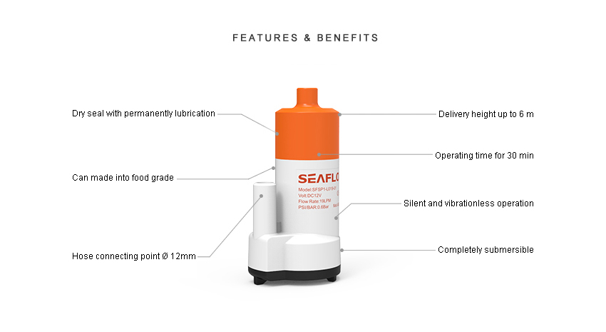 Pompa zanurzeniowa SEAFLO 12 napięciowa. Te pompy są prawdziwymi potęgami i mogą być używane również w ruchu. Mogą zapewnić 30 minut ciągłej pracy po podłączeniu do odpowiedniego zasilacza, akumulatora samochodowego lub systemu zasilania energią słoneczną. Ten produkt wykorzystuje materiał spożywczy o szerokim zakresie zastosowań. Cicha, pozbawiona wibracji praca, uszczelniona na sucho i trwale nasmarowana, niewielkie rozmiary, niewielka waga, łatwa instalacja i przenoszenie.