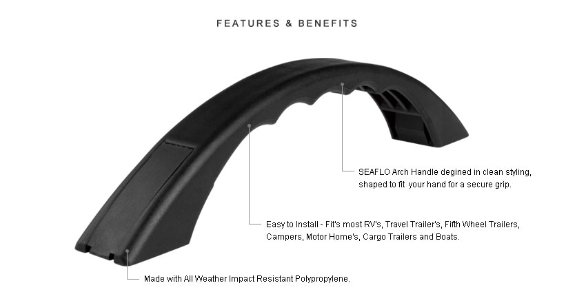 Uchwyt łukowy SEAFLO zaprojektowany w czystej stylistyce, dopasowany do dłoni, zapewniający pewny chwyt. Łatwy w instalacji – pasuje do większości kamperów, przyczep turystycznych, przyczep siodłowych, kamperów, samochodów kempingowych, przyczep towarowych i łodzi.