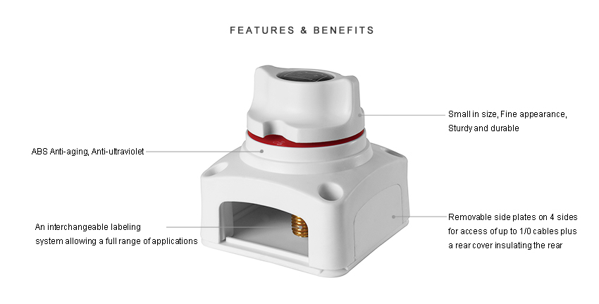 • Zdejmowane płyty boczne z 4 stron umożliwiające dostęp do kabli 1/0 oraz tylna pokrywa izolująca tylne zaciski przed wszelkimi zwarciami